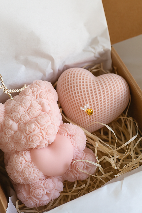Podarite nekaj posebnega! Ta čudovit komplet vključuje dve unikatni svečki iz naravnega sojinega voska – eno v obliki prikupnega medvedka in drugo v obliki elegantnega srca.
